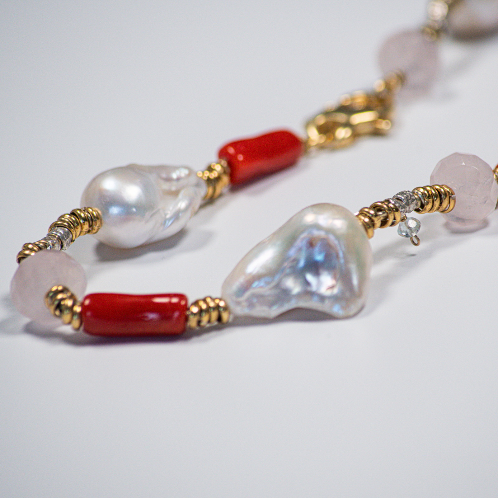 Scopri l’essenza del lusso mediterraneo con la nostra collana con perle barocche e coralli rossi, un’opera artigianale che racchiude lo spirito raffinato di Porto Cervo. Ogni perla barocca, scelta per la sua forma unica, si intreccia a vivaci coralli rossi, piccoli cristalli dal bagliore discreto e dettagli dorati dal fascino senza tempo.