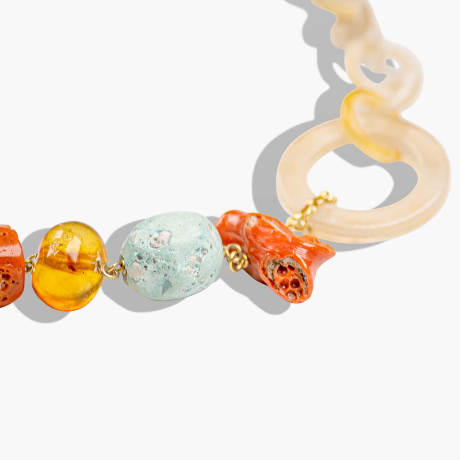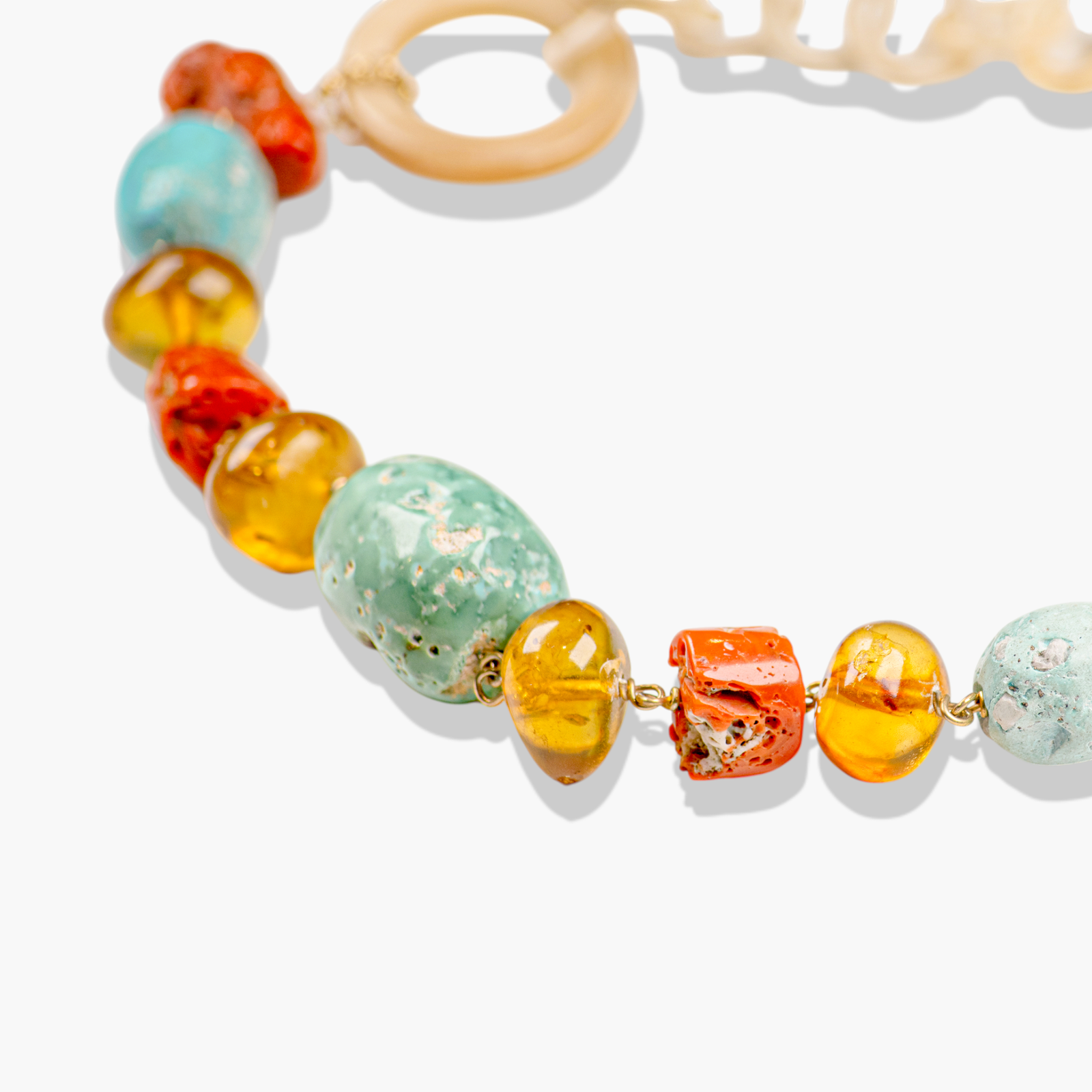 Scopri la raffinatezza unica di questa collana statement con pietre multicolori. Realizzata artigianalmente, unisce vibranti perle di turchese, ambra e corallo a grandi maglie di resina, creando un accessorio audace ed elegante che attira l’attenzione. La lunghezza della collana è regolabile, adattandosi perfettamente a ogni décolleté. Ideale per dare un tocco di colore e originalità ai tuoi look, ogni pezzo è unico grazie alle diverse sfumature delle pietre naturali.