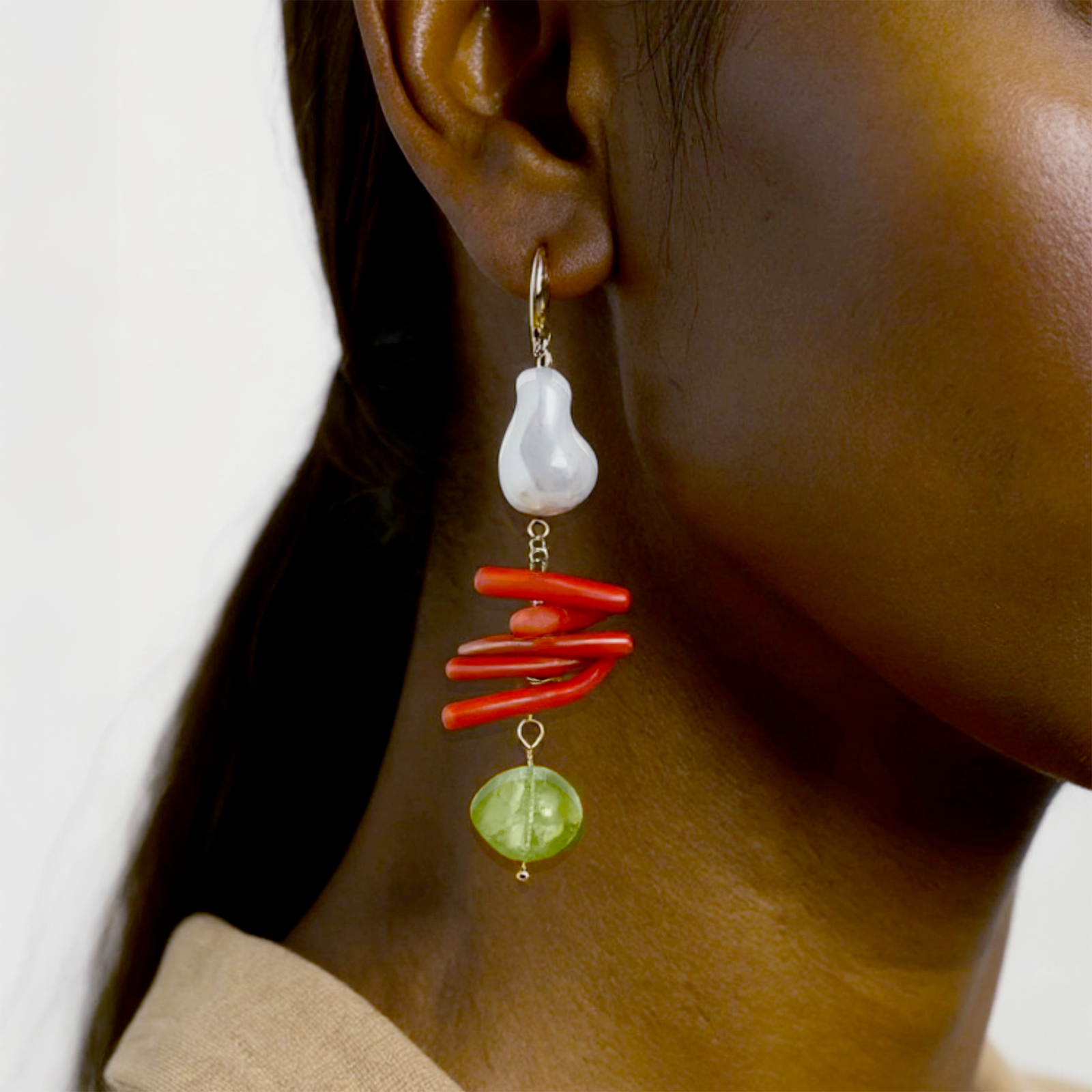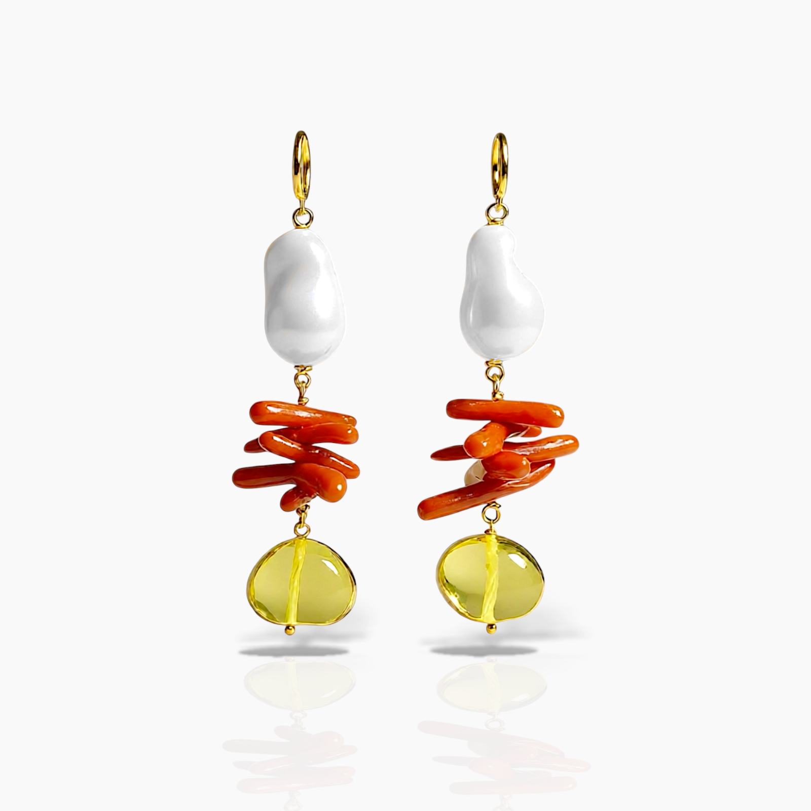 Esalta il tuo stile con questi orecchini artigianali asimmetrici, realizzati con perle barocche d’acqua dolce, bastoncini di corallo rosso e perline in vetro giallo. Il design unico ed artistico dona un tocco audace e sofisticato, perfetto per ogni occasione. Ogni pezzo, lungo circa 5 cm, unisce tinte luminose e forme irregolari per valorizzare la tua unicità. Ideali per chi ama gioielli originali e fatti a mano.